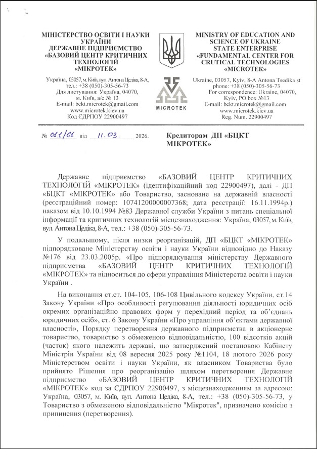 Товариство з обмеженою відповідальністю «Мікротек» буде правонаступником усіх прав та обов’язків державного підприємства «БАЗОВИЙ ЦЕНТР КРИТИЧНИХ ТЕХНОЛОГІЙ «МІКРОТЕК» код за ЄДРПОУ 22900497. Кредитори мають право заявити свої вимоги до підприємства протягом двох місяців з дати внесення зазначеного запису до Єдиного державного реєстру.