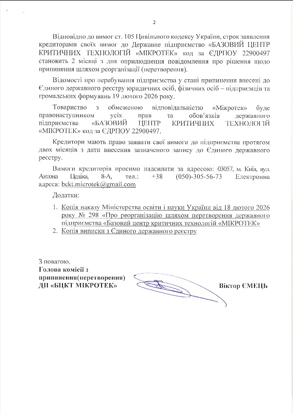 Додатки:1. Копія наказу Міністерства освіти і науки України від 18 лютого 2026 року Nº 298 «Про реорганізацію шляхом перетворення державного підприємства «Базовий центр критичних технологій «МІКРОТЕК»